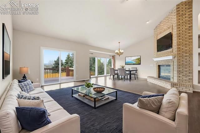 A rare gem in the highly sought-after Summerfield neighborhood in District 20! This immaculate walkout rancher is perfectly tucked away on a quiet cul-de-sac and sits on a beautifully landscaped 0.43-acre lot with breathtaking mountain views. From the moment you step inside, you’ll be captivated by the open floor plan, soaring vaulted ceilings, expansive windows, and stunning architectural details, including a grand fireplace with custom cutout niches. The bright, walkout kitchen is designed for both everyday living and entertaining, featuring profile stainless steel appliances, a spacious island with elegant Carrera marble, and a stylish ceramic tile backsplash. Rich hardwood floors add warmth and sophistication throughout the main living areas. The massive primary suite offers a true retreat, complete with a luxurious 5-piece en suite, walk-in closets, custom shelving, and private walkout access to the deck—perfect for enjoying peaceful mornings with mountain views. With five spacious bedrooms, there’s room for everyone to spread out and feel at home. Step outside to enjoy incredible views of Pikes Peak and the Air Force Academy from not one, but two expansive decks—ideal for morning coffee or evening gatherings under the Colorado sky. The finished walkout basement creates a welcoming extension of the home, featuring a large rec room with its own fireplace, perfect for cozy nights or entertaining guests, along with ample storage rooms to keep everything organized. Additional highlights include an oversized 3-car garage, brand new carpet and paint, and solar panels—keeping electric bills impressively low. Located just minutes from the Shops at Briargate, dining, and entertainment, yet within walking distance to conveniences. This home offers not just space, but a lifestyle of comfort, beauty, and unforgettable views—truly a must-see!